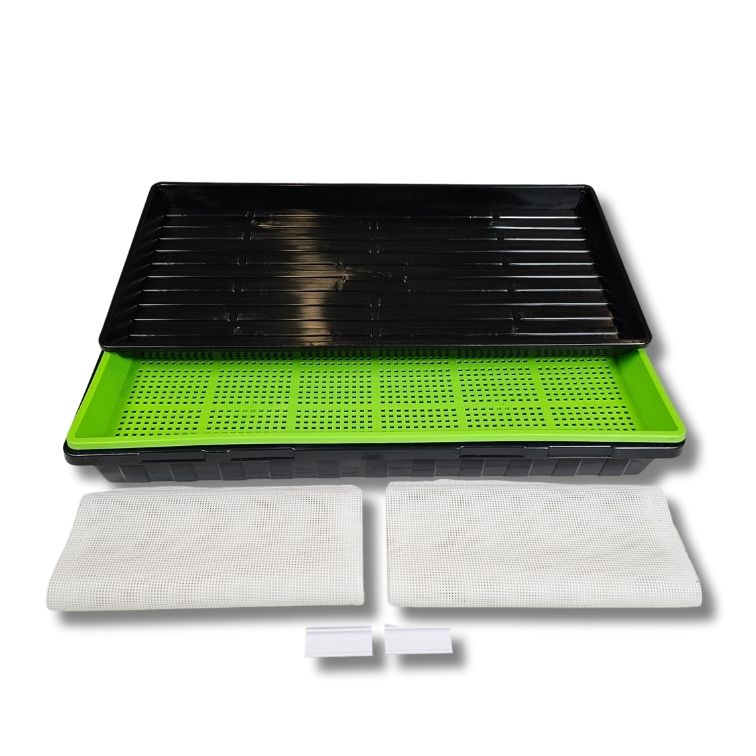 Pendant la germination (3-5 jours) : Utilisez le plateau sans trou de 2,5 cm pour une germination standard avec obscurcissement et poids. Les graines n'ont pas encore besoin du réservoir.