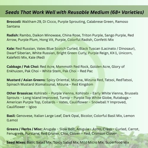 Infographic listing microgreen seed varieties that work well with reusable grow mediums, including broccoli, radish, kale, cabbage, mustard greens, basil, and salad mixes.