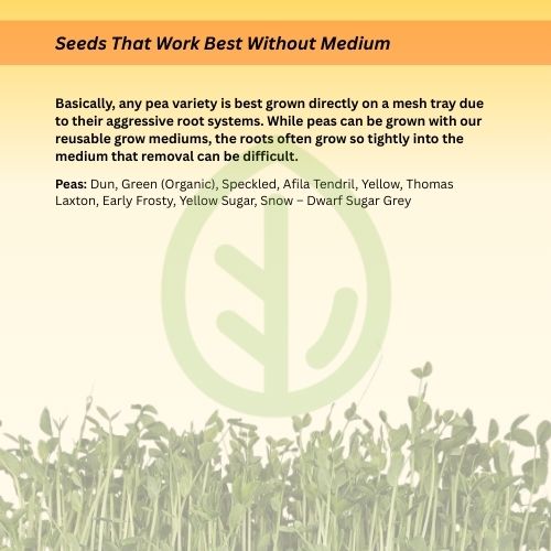 • Load image into Gallery viewer, Infographic explaining which microgreen seeds grow best without a grow medium, highlighting pea varieties that perform best on mesh trays due to aggressive root systems.